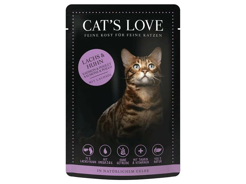 | Zusammensetzung | Lachs & Huhn 71% (Hühnerfleisch, Lachs, Hühnerherzen, Hühnerleber, Hühnermägen, Hühnerhälse), Brühe 27.7%, Mineralstoffe 1%, Lachsöl 0.2%, Petersilie 0.1% |