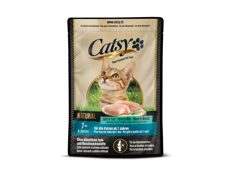 Mit 7 Jahren treten bei Katzen erste physiologische Veränderungen auf. Dank funktionalen Inhaltstoffen unterstützt Catsy Ihre Katze bei diesem Prozess. Im Futter enthalten ist Frischfleisch mit natürlich vorkommenden Vitaminen, hoch verdaulichen Proteinen und einem sehr guten Geschmack. Das Futter unterstützt die natürlichen Abwehrkräfte und danke der zusätzlichen Ergänzung mit Vitamin E wirkt es sich positiv auf die Bekämpfung der Zellalterung aus. Fisch- und Sonnenblumenöle sind reich an essentiellen Fettsäuren Omega 3 und 6 und fördern eine gesunde Haut und Haare, durch den optimalen PH-Wert im Urin wird das Risiko von Harnsteinbildung reduziert und Chondroitin und Glucosamin unterstützen die Gesundheit der Gelenke. Das Futter enthält keine künstliche Farb- und Geschmacksstoffe.