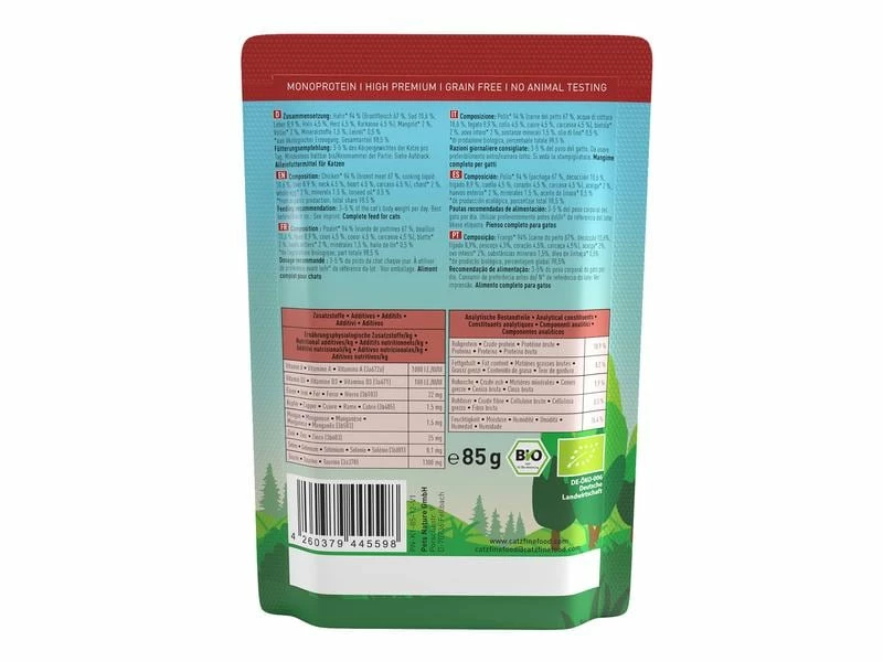 Die ausgewogene Rezeptur ist ideal auf die Bedürfnisse von Katzen zugeschnitten. Jegliches Fleisch, Innereien, sowie die katzengerechten geringen Anteile von Obst und Gemüse stammen aus ökologisch zertifizierter Landwirtschaft. Natürlich gentechnik-frei. Katzen lieben den intensiven Geschmack des frisch verarbeiteten Bio-Fleisches und -Innereien. Auch ernährungssensible oder von Futtermittelallergien betroffene Samtpfoten dürfen catz finefood BIO geniessen, denn jede Geschmacksrichtung basiert auf einer Fleischsorte und die transparente Deklaration erleichtert die Auswahl der passenden Sorte für Ihr Tier.