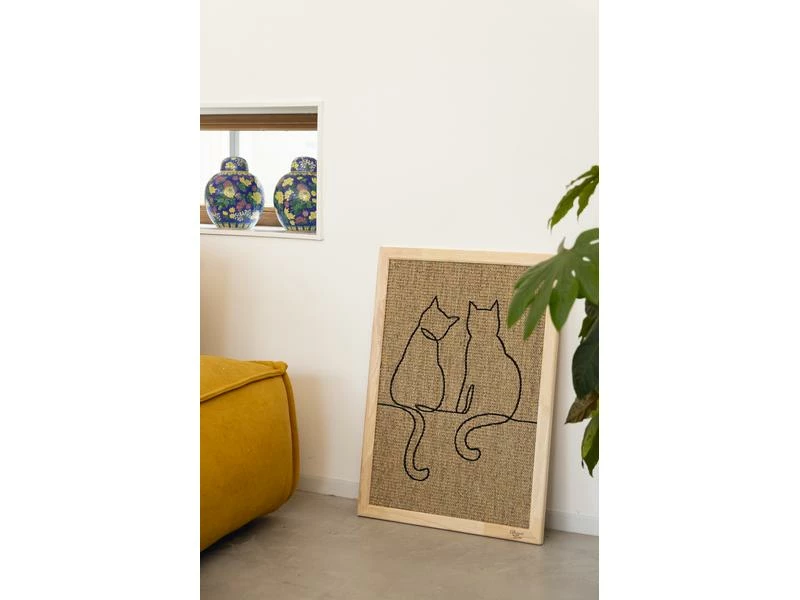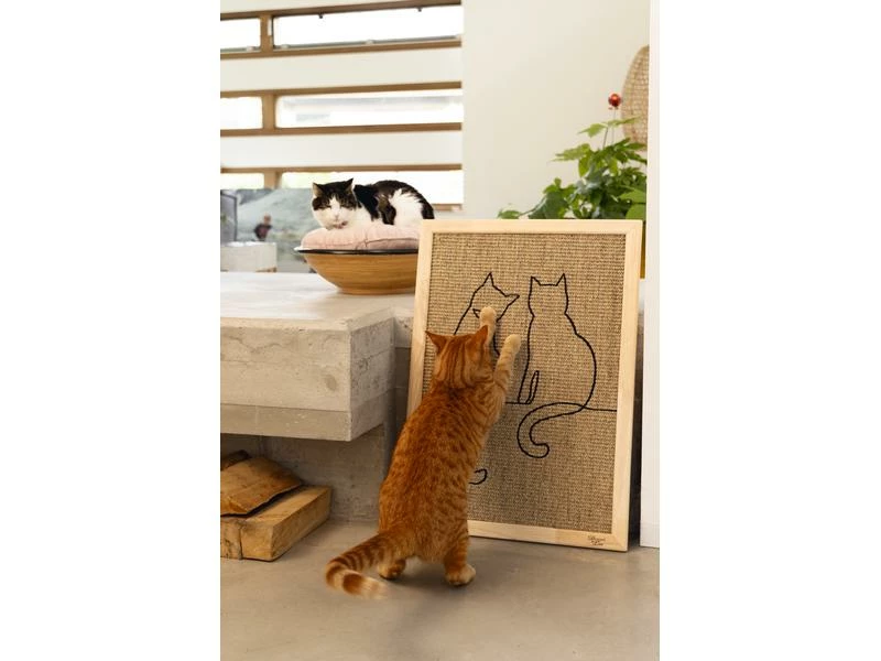 Das Designed by Lotte Katzenkratzbrett ist ein echtes Design-Kratzbrett. Es sieht eher aus wie ein Gemälde als ein Kratzbrett. Poezels ist aus einer Sisalmatte gefertigt und mit Gummibaumholz gerahmt. Das Gummibaumholz hat eine schöne hellcremige Farbe, die es in jedem Interieur schön macht. Auf dem Gemälde sind zwei Katzen abgebildet, was es auch schön macht, es im Haus zu platzieren. Ein extra grosses Regal, damit Ihre Katze genügend Platz zum Kratzen hat.