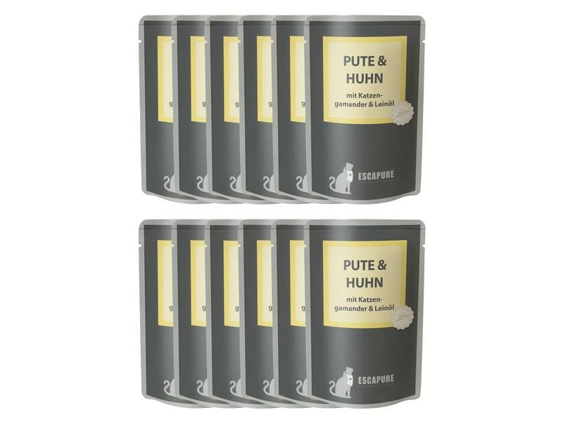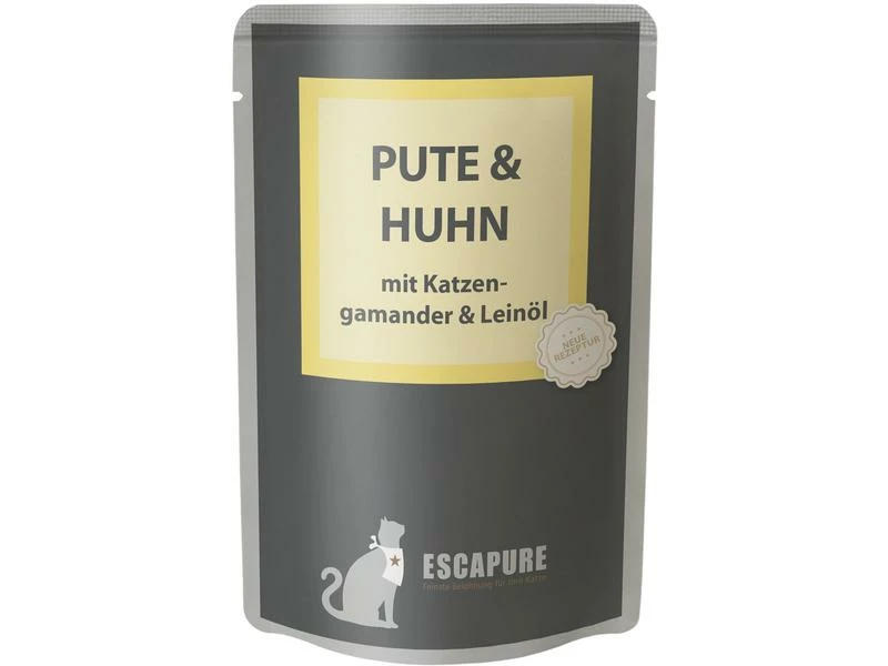 Feinstes Nassfutter aus Pute und Huhn mit Katzengamander und Leinöl im 100g Pouch