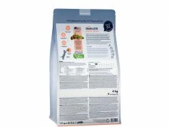 | Zusammensetzung | Geflügelprotein**, Lachsmehl (12%), Maismehl, Reismehl, Mais, tierisches Fett (u. a. Geflügel), Kartoffelflocken, Grieben, Reisprotein*, Sonnenblumenöl (2.4%), Lignocellulose (2%), Fischhydrolisat*, Rübenmelasseschnitzel* (entzuckert), Rapsöl (0.6%), Trockenvollei, Kaliumchlorid, Hefe*, Apfeltrester* (0.4%), Natriumchlorid, Karotten (0.25%), Meeresalgen, Leinsamen (0.16%), Chicoréepulver (0.15% = 0.1% Inulin), Yucca schidigera* (0.1%), Erbsenflocken (0.13%), Rote Beete Pulver (0.13%), Muschelfleisch* (0.05%), Hefe* (extrahiert, 0.02% = 0.0032% MOS), Mariendistel, Artischocke, Löwenzahn, Ingwer, Birkenblätter, Brennnessel, Kamille, Koriander, Rosmarin (0.013%), Salbei, Süssholzwurzel, Thymian (Trockenkräuter gesamt: 0.16%); *) getrocknet **) getrocknet, anteilig hydrolisiert. |