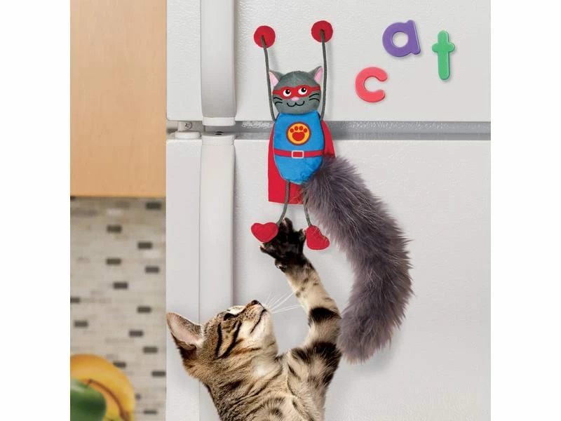Der KONG Magnicat bewahrt Katzen vor Langeweile dank magnetischer Pfoten, mit welchen er hängen bleibt und gleichzeitig endlos unterhaltsame Vielfalt bietet. Unwiderstehlich baumelnde Beine und ein beweglicher Schweif animieren und belohnen instinktives Schlagen, während Knistergeräusche das natürliche Jagdverhalten belohnen. Knistergeräusche und KONG North American Premium Catnip lassen die Heldentaten länger andauern.