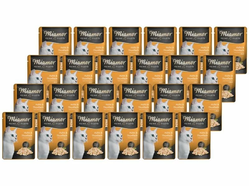 Ausschliesslich helle Filetstückchen vom Huhn und vom Thunfisch in delikater Jelly. Eine hochwertige Filet-Spezialität – besonders leicht verdaulich, für die anspruchsvolle Katze. Auch für ältere und übergewichtige Katzen.