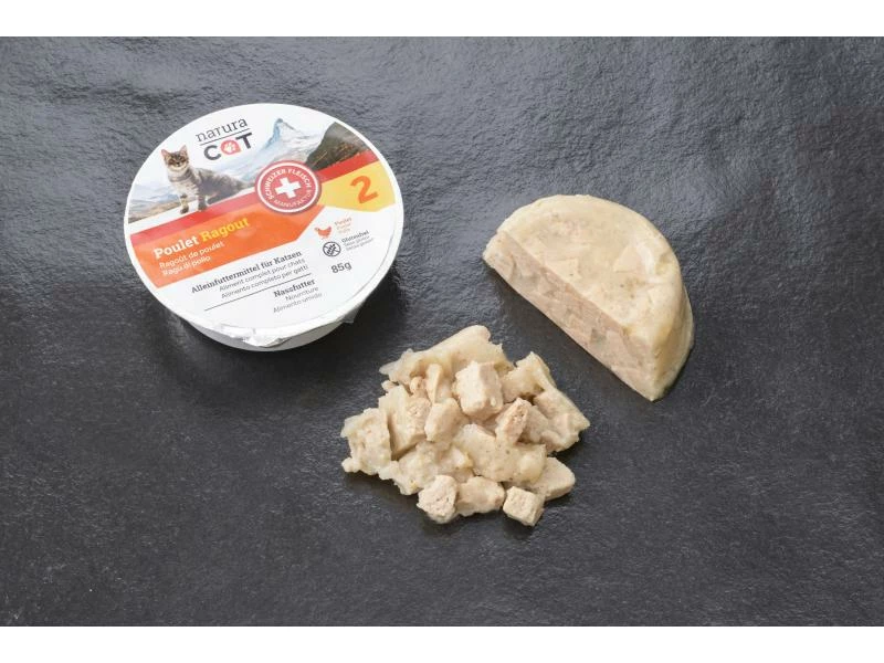 | Zusammensetzung | Pouletfleisch (CH) 59.66%, Wasser 22.43%, Karkassen (CH) 14.55%, Pouletleber (CH) 2.82%, Vitamin D3, Taurin, Vitamin E, Vitamin B1, B6, Biotin |