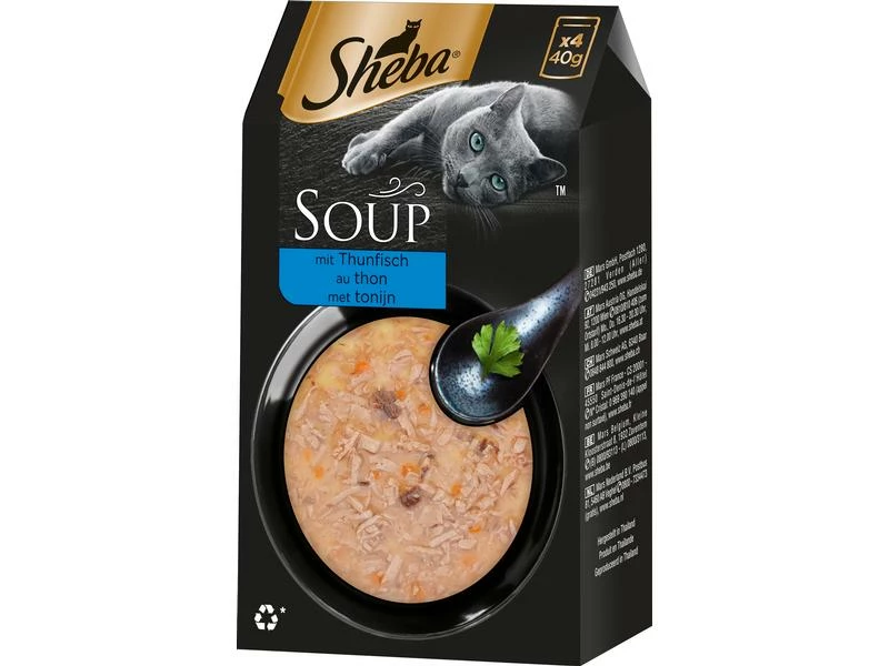 Sheba Classic Soup sind luxuriöse Mahlzeiten zum Wohlfühlen. Delikate Brühe aus feinsten Zutaten werden mit Liebe und nach aussergewöhnlichen Rezepten kreiert, bieten eine abwechslungsreiche Ergänzung auf dem Speiseplan und das gewisse Extra – ideal für kleine Schleckermäuler! Schmackhafter Fisch, Huhn oder Meeresfrüchte sowie gesundes Gemüse als Einlage sorgen für ein aufregendes Geschmackserlebnis und Abwechslung im Napf. Und dank des praktischen Portionsbeutels kann Ihre Katze Sheba Soup immer wieder frisch geniessen. Sheba Classic Soup wird schonend mit erlesenen Zutaten zubereitet und kommt ganz ohne künstliche Farb- und Konservierungsstoffe aus!