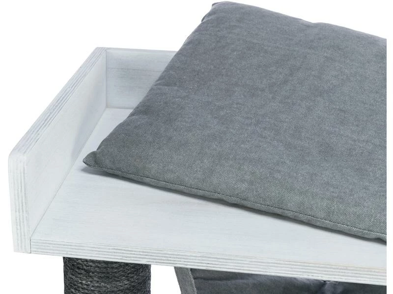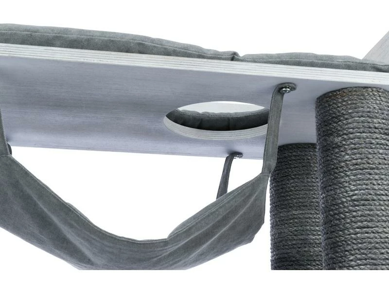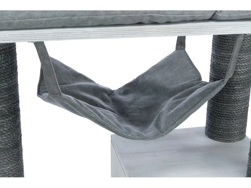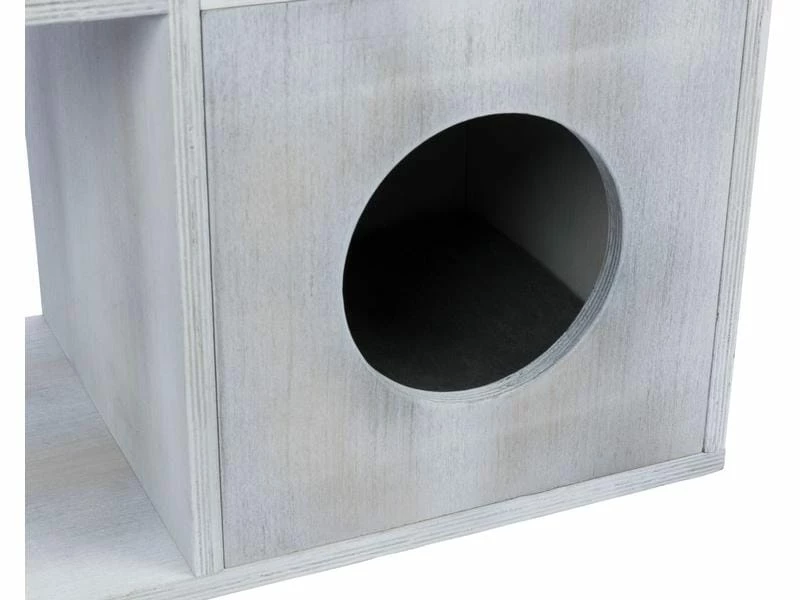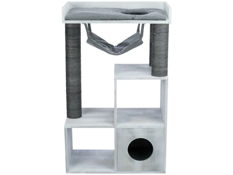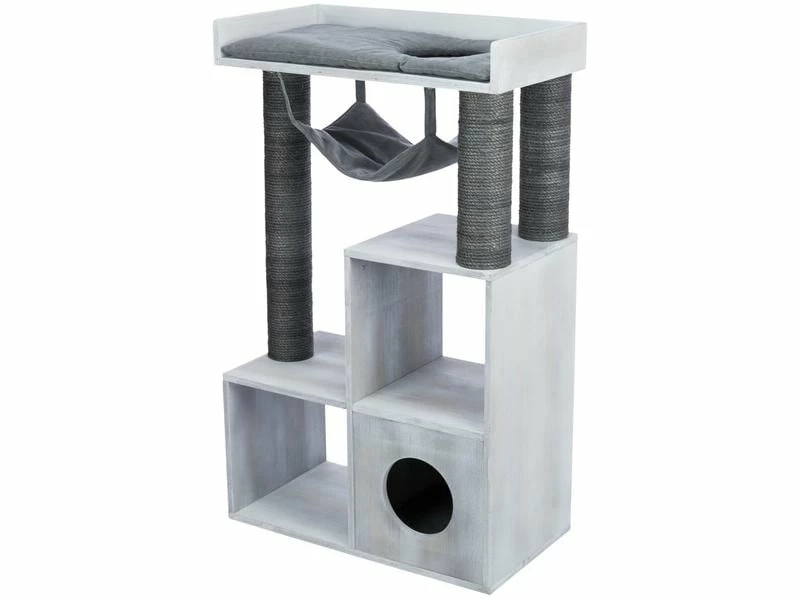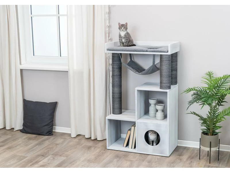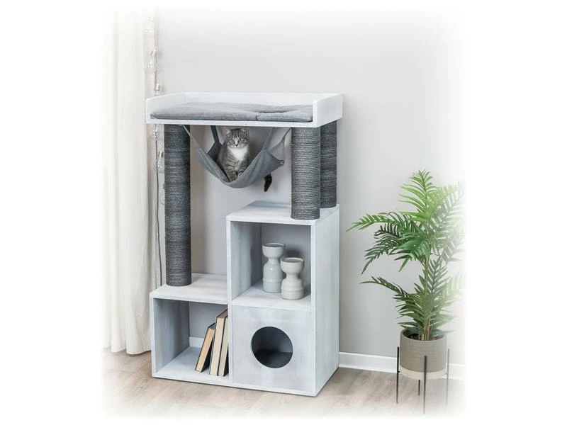 Sind Sie Katzenliebhaber und Bücherwurm? Der stylische und praktische Kratzbaum mit Regalfunktion ermöglicht Ihnen, ihre Bücher unterzubringen und bietet ihrem Stubentiger gleichzeitig ausreichend Platz zum Klettern und Ausruhen. Die Würfel können entweder als Liegefläche für ihre Katze oder als Regal für Bücher verwendet werden. Zudem verfügt der Kratzbaum über eine kuschelige Höhle mit Wendekissen, eine abnehmbare Hängematte sowie ein Bett mit weicher Liegefläche. An den mit Sial umwickelten Stämmen kann sich ihre Samtpfote austoben und die Krallen pflegen.
