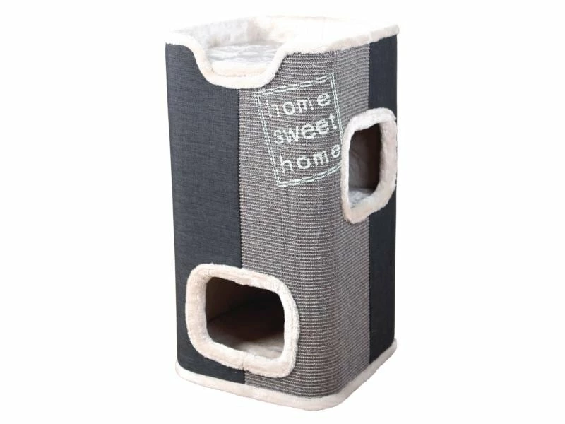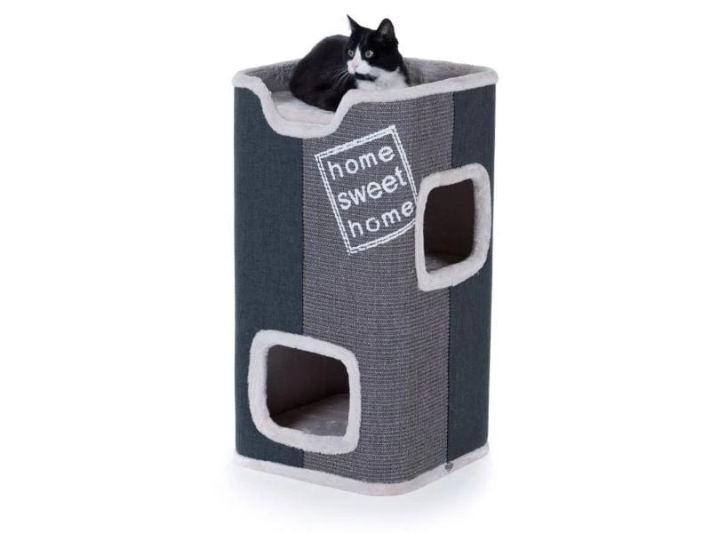 Katzen lieben es, ihre Krallen zu schärfen. Sie lieben es ebenso, sich nach wilden Abenteuern sicher in den eigenen vier Wänden auszuruhen und sie behalten dabei gerne den Überblick. Alle diese Bedürfnisse erfüllt der Katzenturm Jorge. Er bietet einen weichen Webstoff-Plüsch-Bezug, in den sich Katzen so gerne reinkuscheln und genügend Sisalkratzflächen, an denen sich Ihr Liebling austoben kann. Der Turm besitzt zwei Etagen, die ebenfalls mit weichem Plüsch ausgestattet sind. Auf jeder Ebene findet sich ein Wendekissen, dessen Bezug Sie in der Maschine bis zu 30° waschen können. Der Bezugsstoff kann von Hand gereinigt werden.