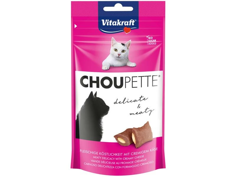 Choupette, das sind lecker fleischige Snack-Häppchen, die es wahrhaft in sich haben: Denn Stück für Stück überrascht Choupette Ihren Stubentiger mit einer köstlichen Füllung aus herrlich cremigem Frischkäse! Hergestellt mit besten Zutaten und ohne Zusatz von Zucker werden die Leckerlis schonend im Ofen gegart – das macht sie zudem schön saftig beim Hineinbeissen.
