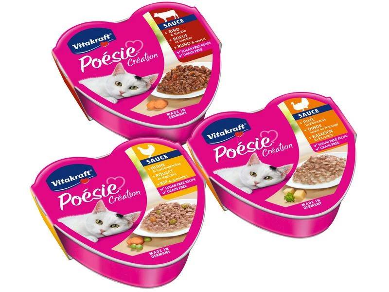 Herzhaft fleischige Häppchen in raffinierten Saucen, zum Teil verfeinert mit köstlichem Gemüse – Poésie® ist jeden Tag aufs Neue ein Gedicht für Ihre Katze! Dieser praktische Vorratspack enthält gleich drei leckere Sorten im Mix. Perfekt für alle, die Abwechslung lieben.