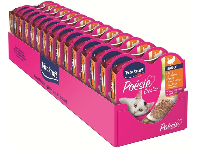Verwöhnen Sie Ihren Stubentiger mit der Poésie Sauce von Vitakraft in der Herzschale. Das schmackhafte Menü ist auf die ernährungsphysiologischen Bedürfnisse von Katzen abgestimmt und überzeugt durch seine Qualität. Mit einer delikaten Sauce verfeinert, ist das leckere Menü jeden Tag aufs Neue ein Gedicht für Ihren Liebling. Das Nassfutter wurde schonend, ohne Zucker und ohne künstliche Farb- und Konservierungsstoffe hergestellt.