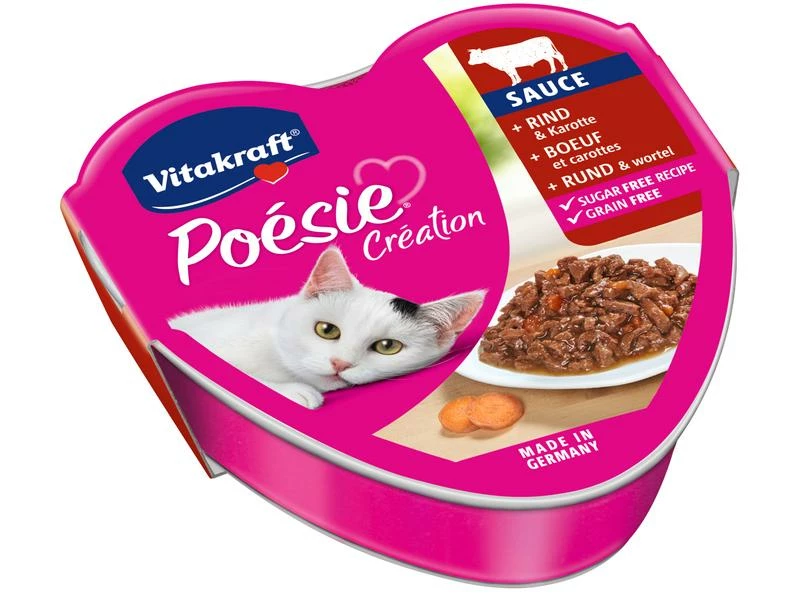 Verwöhnen Sie Ihren Stubentiger mit der Poésie Sauce von Vitakraft in der Herzschale. Das schmackhafte Menü ist auf die ernährungsphysiologischen Bedürfnisse von Katzen abgestimmt und überzeugt durch seine Qualität. Mit einer delikaten Sauce verfeinert, ist das leckere Menü jeden Tag aufs Neue ein Gedicht für Ihren Liebling. Das Nassfutter wurde schonend, ohne Zucker und ohne künstliche Farb- und Konservierungsstoffe hergestellt.