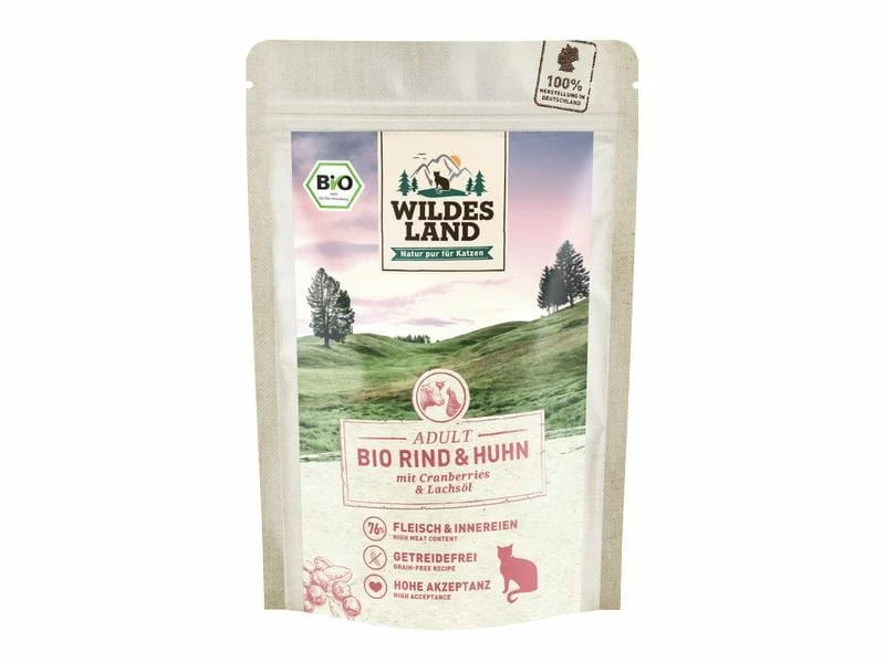 Das Nassfutter Rind & Huhn aus der Linie Bio Adult versorgt Ihre Katze mit allen wichtigen Nährstoffen und ist mit seinen vollständig naturbelassenen Zutaten besonders verträglich und zudem äusserst schmackhaft. Die getreidefreie Rezeptur enthält 76% Fleisch und Innereien vom Rind und Huhn in Bio-Qualität aus kontrolliert biologischer Landwirtschaft und sichert damit die Proteinversorgung erwachsener Katzen. Die Zugabe von Lachsöl und erlesenen Cranberries macht das Nassfutter leicht verdaulich, weshalb es sich auch für ernährungssensible Katzen eignet. Im Nassfuttermenü Rind & Huhn werden hochwertiges Muskelfleisch und Innereien verarbeitet und durch die Zugabe von Lachsöl auf natürliche Weise mit wertvollen essenziellen Fettsäuren ergänzt. Die Verarbeitung des fettarmen Herzmuskels vom Rind sowie von Leber und Lunge sichert die Versorgung Ihrer Katze mit natürlichem Vitamin A, Eiweiss und Calcium. Da in der kontrolliert biologischen Landwirtschaft auf den vorbeugenden Einsatz von Antibiotika verzichtet wird und der Einsatz von Hormonen, Wachstums- und Leistungsförderern verboten ist, können Sie sich sicher sein, dass Wildes Land Bio besonders natürlich und unbelastet ist und eine artgerechte Haltung der Nutztiere unterstützt.