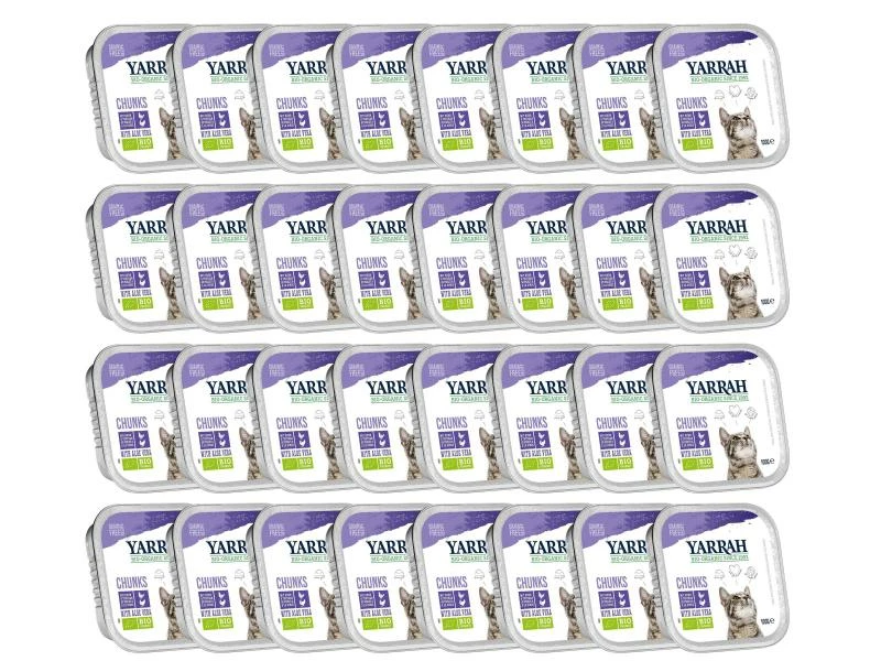 Das Bio-Nassfutter Chunks mit Huhn und Truthahn von Yarrah besteht aus leckeren getreidefreien Bröckchen mit Huhn, Truthahn und Aloe vera. Für Katzen aller Rassen und Altersgruppen stellt es eine vollwertige, nährstoffreiche und sehr schmackhafte Mahlzeit dar. Das Futter ist rein biologisch, ohne künstliche Zusatzstoffe, Pestizide und Geschmacksverstärker. Bei der Herstellung wurden nur die am leichtesten verdaulichen Eiweisse verwendet – um sicherzustellen, dass Ihre Katze genau das bekommt, was sie braucht. Dadurch, dass das Aroma des Fleisches von der Sosse aufgenommen wird, ist das Nassfutter besonders geschmackvoll.
